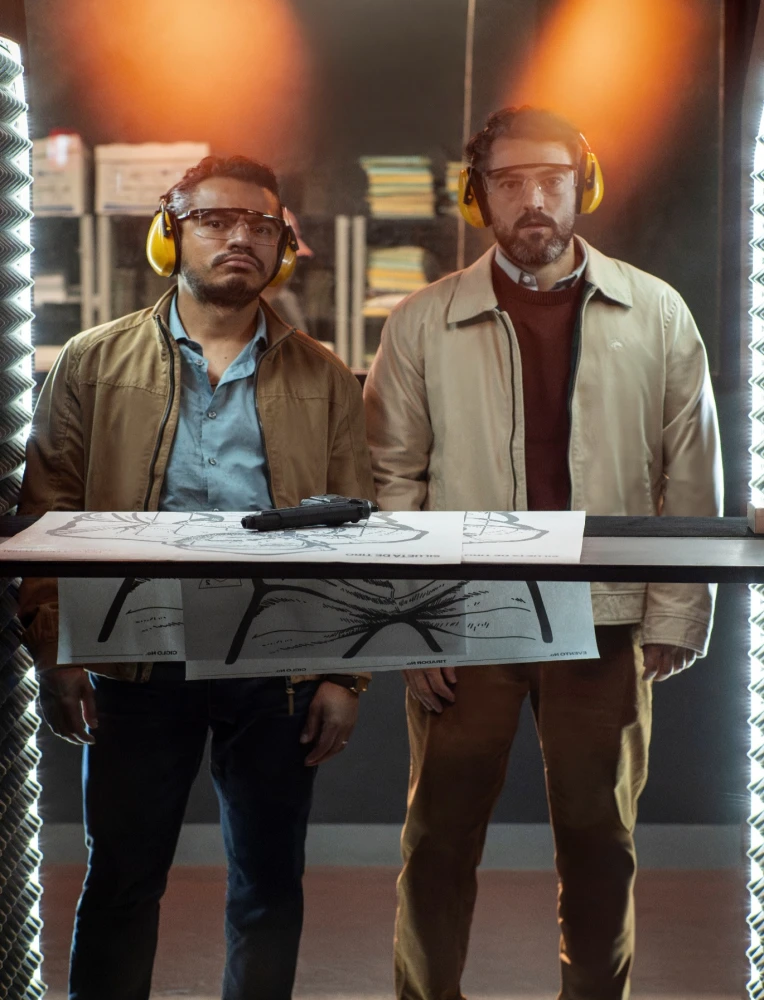 La hora de los valientes retoma esta estructura casi sin alteraciones. Se conservan los nombres de los personajes, las situaciones clave y buena parte de los diálogos. Luis Gerardo Méndez, actor ya consagrado por Nosotros, los Nobles (2013) y la serie Club de cuervos (2015-2019), interpreta al psicoanalista obligado a acompañar a un policía devastado por la traición conyugal, encarnado por Memo Villegas, actor conocido por su trabajo en Narcos: México (2018), La bandida (2019) y Harina (2022). Como se recordará, Memo Villegas se hizo famoso principalmente por el sketch del “teniente Harina” que se viralizó en 2019. Ambos actores cumplen con solvencia; sin embargo, el acento adoptado por Méndez no termina de asentarse. No es plenamente ‘chilango’ ni remite con claridad a otra región del país, lo que introduce una leve pero persistente distancia. Más que una propuesta de personaje, este tono híbrido termina siendo un elemento que distrae al espectador de la narrativa. Tal vez el actor intentó una operación similar a la que Cecilia Suárez realizó con Paulina de la Mora en La casa de las flores, pero aquí el experimento no alcanza la misma eficacia. Quien interpreta a Diana (la esposa del psicoanalista) es Gabriela Iscovich en Argentina y, en México, Verónica Bravo. Las dos interpretan en forma excelente su papel que, aunque secundario, es muy importante para el desarrollo de la trama.