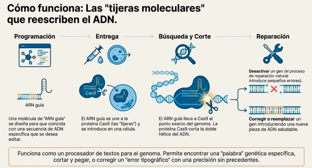La tecnología CRISPR se puede entender con una analogía simple: si el genoma fuera una gran enciclopedia con muchos volúmenes, el proceso de laboratorio CRISPR sería como usar la función de “Buscar y Reemplazar” en una computadora. El RNA guía es la palabra específica que tecleas en la barra de búsqueda; la Cas9 es el cursor que salta a la página exacta, al renglón preciso, y lo resalta; y la plantilla reparadora es el nuevo texto que introduces para corregir un error o actualizar la información.