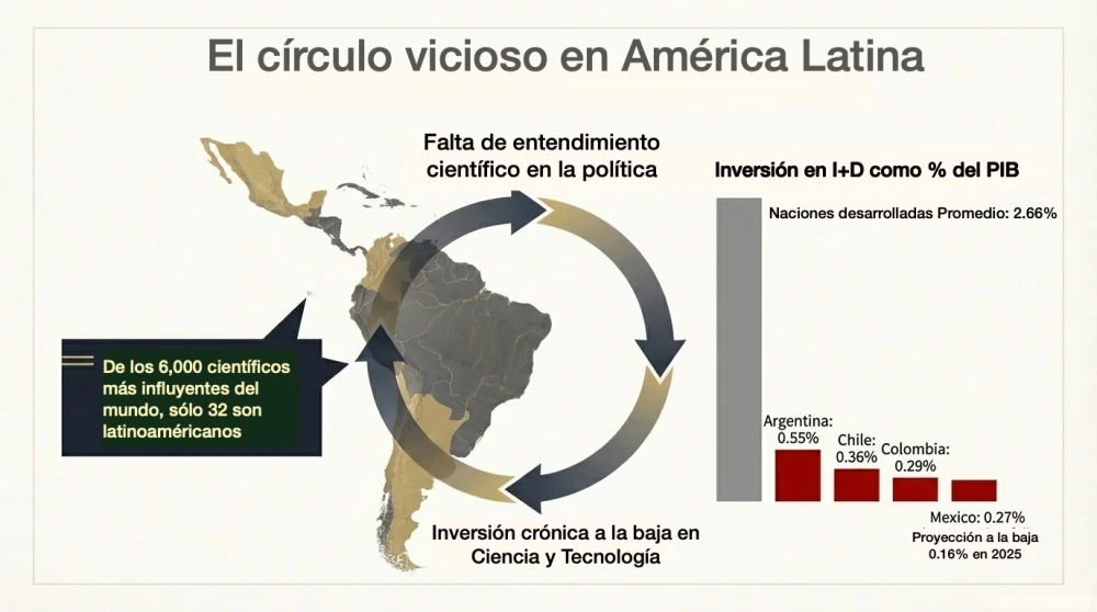 Lo que sí sabemos del contexto científico latinoamericano son la producción e inversión científica: de 6,000 científicos más influyentes del mundo, sólo 32 son latinoamericanos: 15 de Brasil, 8 de México, 3 de Argentina, 3 de Chile, 2 de Colombia y 1 de Panamá.