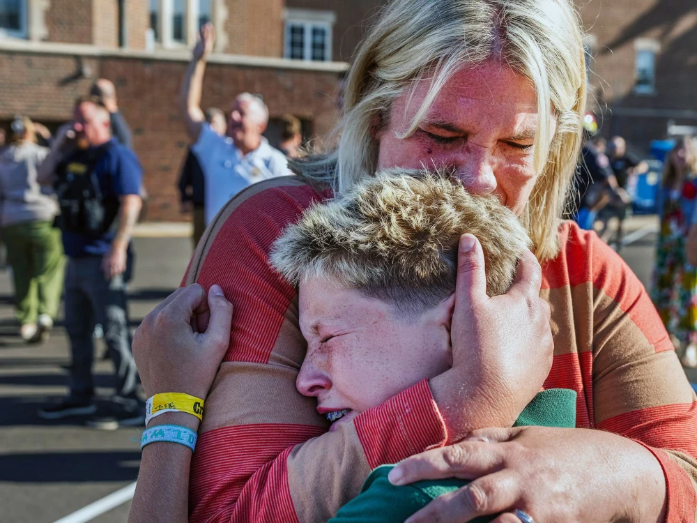 Familias tratando de consolarse después del tiroteo en una escuela católica en Minneapolis. Foto: AP