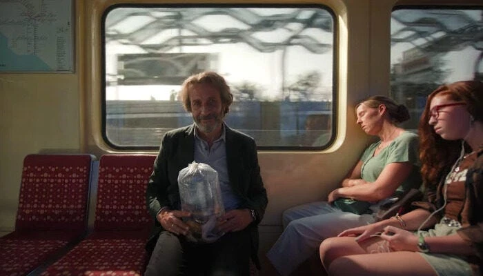 Fotograma de la secuencia del metro en donde Silverio Gama aparece con un frasco con ajolotes.