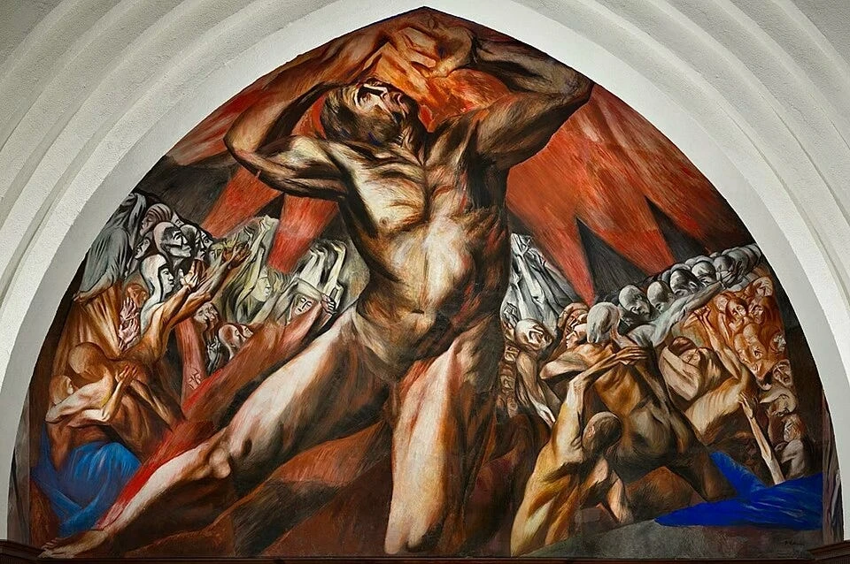 Una de las representaciones de Prometeo que más me han impresionado es la de José Clemente Orozco (jalisciense al igual que Guillermo del Toro) en el mural que pintó en 1930 y que se considera el primero realizado en Estados Unidos. Esta joya se encuentra en Pomona College, al este de Los Ángeles. En el centro destaca un musculoso titán que tiende las manos hacia lo alto para robar el fuego a los dioses; a sus costados, una multitud de personas parece contenta de recibir el regalo, mientras otra parte permanece indiferente o temerosa. Por entregar el fuego —el conocimiento— a los hombres, Prometeo fue severamente castigado por Zeus. Mientras veía la película de Guillermo del Toro, no podía dejar de pensar en ese mural. Víctor Frankenstein se atreve a desafiar a la muerte, insuflando vida en la materia muerta, jugando a ser Dios. Y será castigado por la criatura que él mismo creó.