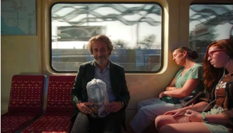 Fotograma de la secuencia del metro en donde Silverio Gama aparece con un frasco con ajolotes.