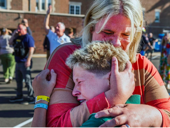 Familias tratando de consolarse después del tiroteo en una escuela católica en Minneapolis. Foto: AP