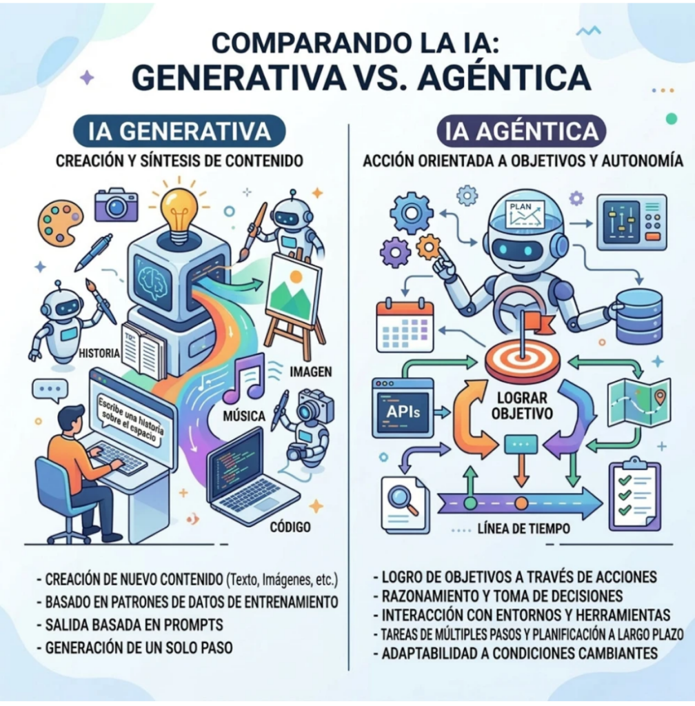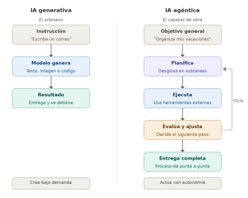 La diferencia fundamental no es de grado, sino de naturaleza: pasamos de una IA que crea a una IA que actúa como se ilustra en el diagrama siguiente.