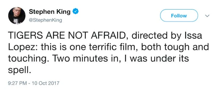 Quien puso esta película en el radar del público fue Stephen King, el aclamado autor de novelas de terror, misterio y fantasía, cuando escribió en su cuenta de X (antes Twitter): “Tigers Are Not Afraid (título con el que se conoce la película en inglés), directed by Issa López: this is one terrific film, both tough and touching. Two minutes in it, I was under its spell”.