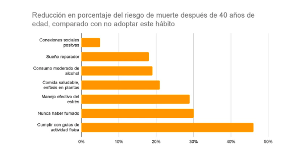 Vale la pena explorar cada uno de esos factores en futuros artículos de Código Beta. Pero por lo pronto te dejo una gráfica de los hábitos en el estilo de vida que impactan en la esperanza de vida según un estudio en EEUU que demostró que adoptar ciertos hábitos saludables una persona de 40 años puede esperar vivir 20 años más que una persona que no los adopte.