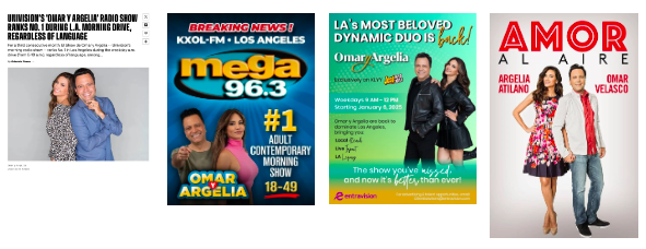 Foto arriba izq: durante 18 años en Univision, la rompíamos en los ratings por encima de la radio en inglés. Foto arriba derecha: también en La Mega alcanzamos el éxito. Foto abajo izq.: nuestra llegada a Entravision donde actualmente se transmite nuestro show de radio. Foto abajo derecha: portada de nuestro libro Amor Al Aire.