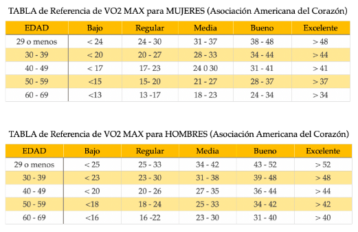 Diversas organizaciones han publicado tablas de referencia de VO2 max para hombres y mujeres según tu edad, ubica tu motor biológico en las siguientes tablas.