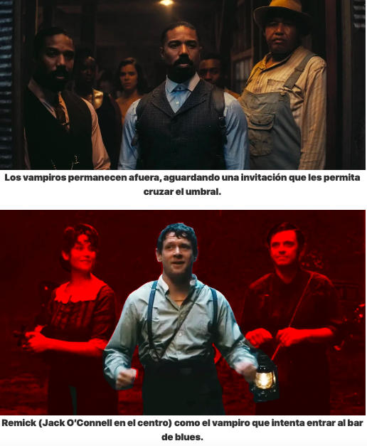 Casi toda la acción se desarrolla durante la noche de apertura del club de blues, cuando un grupo de figuras vampíricas encabezadas por Remick (Jack O’Connell) intenta irrumpir en el local. Vemos por primera vez a Remick (un vampiro de origen irlandés) cuando huye de un grupo de indígenas choctaw que intentan capturarlo. Siguiendo la convención vampírica instaurada por Bram Stoker en su novela sobre Drácula, Remick y sus seguidores no pueden entrar al bar sin ser antes invitados por alguien que se encuentre dentro. De esta manera, el salón de baile funciona como un espacio comunitario, casi como un refugio colectivo. El juke joint no es solo un bar donde se escucha música; es un espacio donde la memoria cultural del blues se mantiene viva. La prohibición que detiene a Remick y a sus seguidores en la puerta funciona así como una metáfora de protección colectiva: el mundo de los vivos se resiste a dejar entrar a quienes pertenecen al reino de los muertos.