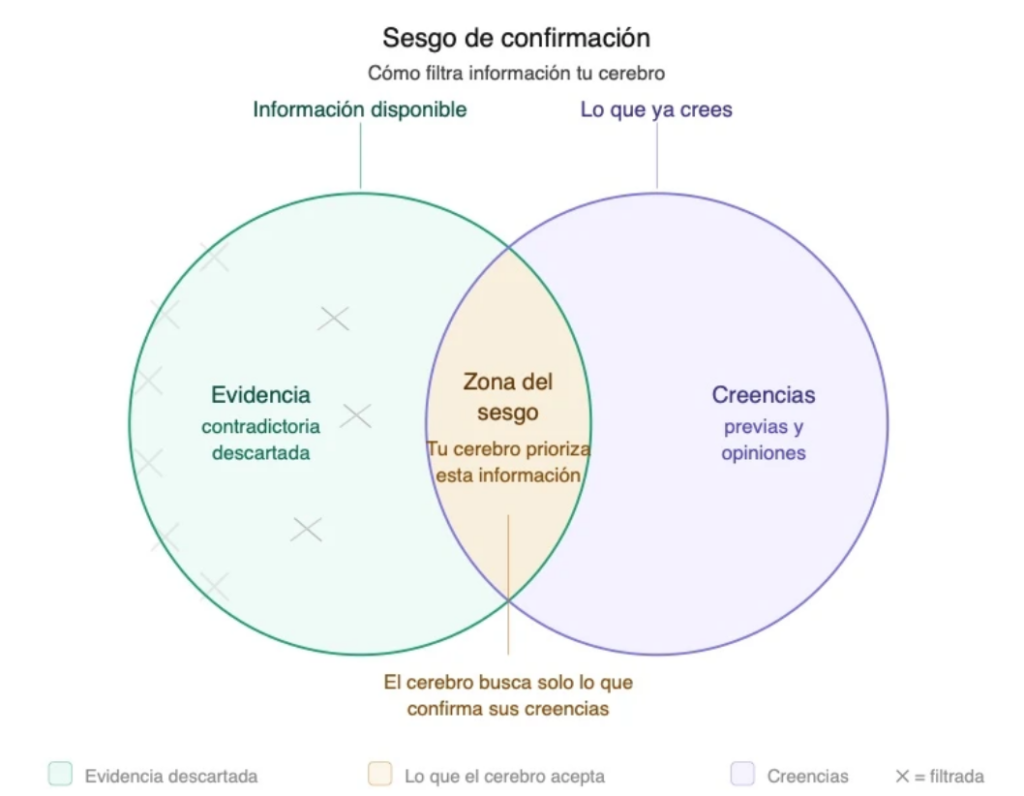 Revisando el diagrama, de izquierda a derecha, la zona verde es toda la información disponible en el mundo que entra por la izquierda, pasa por el filtro del sesgo en la intersección, y solo sobrevive lo que coincide con las creencias y opiniones previas a la derecha en la zona púrpura. Las “X” en la zona verde representan evidencias contradictorias a las creencias y que el cerebro descarta no porque no existan, sino porque resultan incómodas. La zona ámbar es la intersección en donde opera el sesgo de confirmación: el único fragmento de la realidad que el cerebro selecciona activamente, porque coincide con lo que ya creemos.