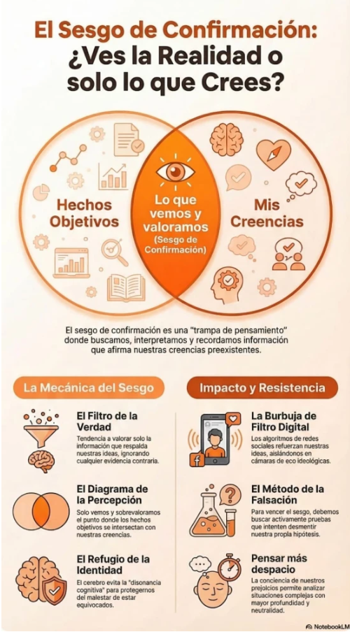 El sesgo de confirmación es la tendencia del cerebro a buscar, interpretar y recordar información de manera que confirme lo que ya creemos, mientras ignora o minimiza lo que lo contradice. Funciona como un algoritmo de redes sociales, pero instalado de fábrica en tu cabeza: filtra la realidad y te muestra, preferentemente, lo que coincide con tus creencias previas.
