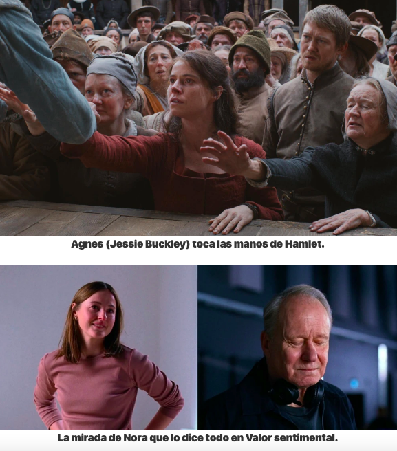 Es inevitable pensar en el paralelismo entre Valor sentimental y Hamnet (Chloé Zhao, 2025) respecto al arte como forma de sanación, ora por la pérdida de un hijo, ora por el abandono de un padre. No se trata de una visión redentora del arte, sino de avanzar un paso en el proceso de duelo o en la reconciliación familiar. En Hamnet, el momento que marca la sanación no ocurre en el discurso, sino en el gesto: cuando Agnes (Jessie Buckley) toca las manos de Hamlet, la mirada de ella concentra lo que ya no necesita decirse. Más exactamente: la sanación no es una epifanía verbal, sino un acto mínimo, corporal. Y este gesto nos conecta con la mirada final entre padre e hija en Valor sentimental. No hay palabras entre ellos. Así, el cine nos dice Joachim Trier, es un arte que confía en el silencio para expresar lo esencial.