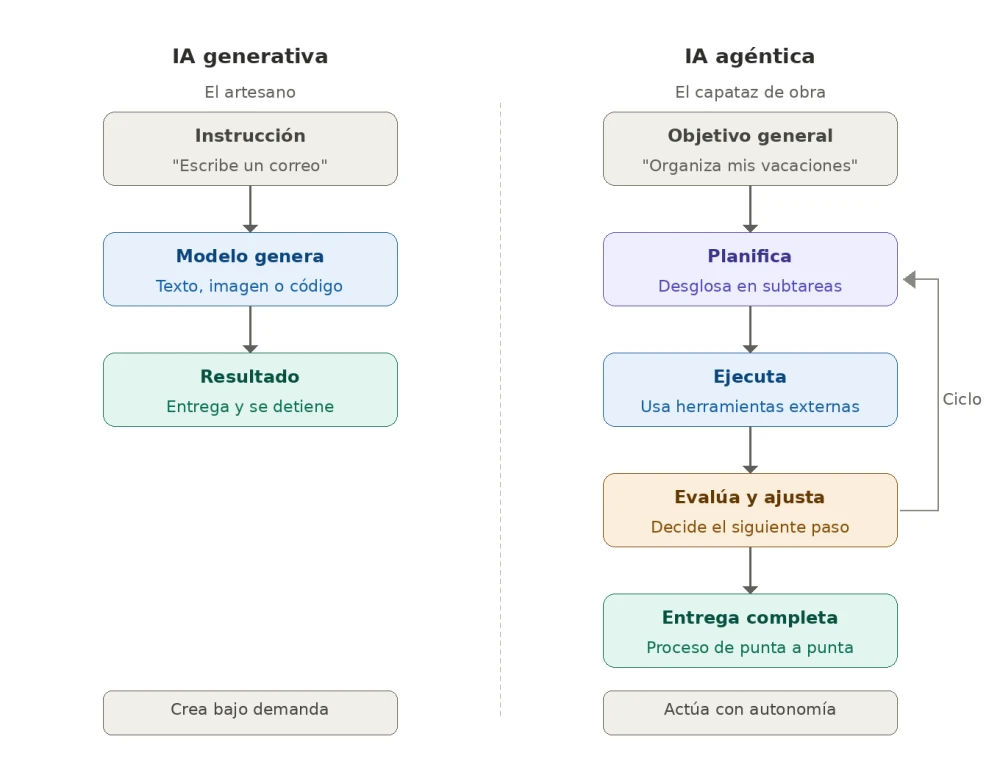 La diferencia fundamental no es de grado, sino de naturaleza: pasamos de una IA que crea a una IA que actúa como se ilustra en el diagrama siguiente.