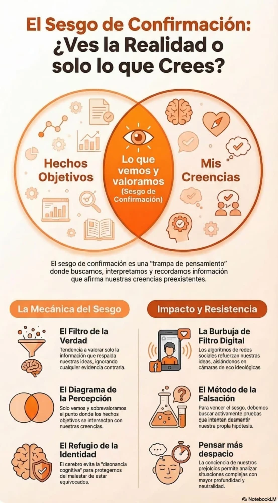 El sesgo de confirmación es la tendencia del cerebro a buscar, interpretar y recordar información de manera que confirme lo que ya creemos, mientras ignora o minimiza lo que lo contradice. Funciona como un algoritmo de redes sociales, pero instalado de fábrica en tu cabeza: filtra la realidad y te muestra, preferentemente, lo que coincide con tus creencias previas.
